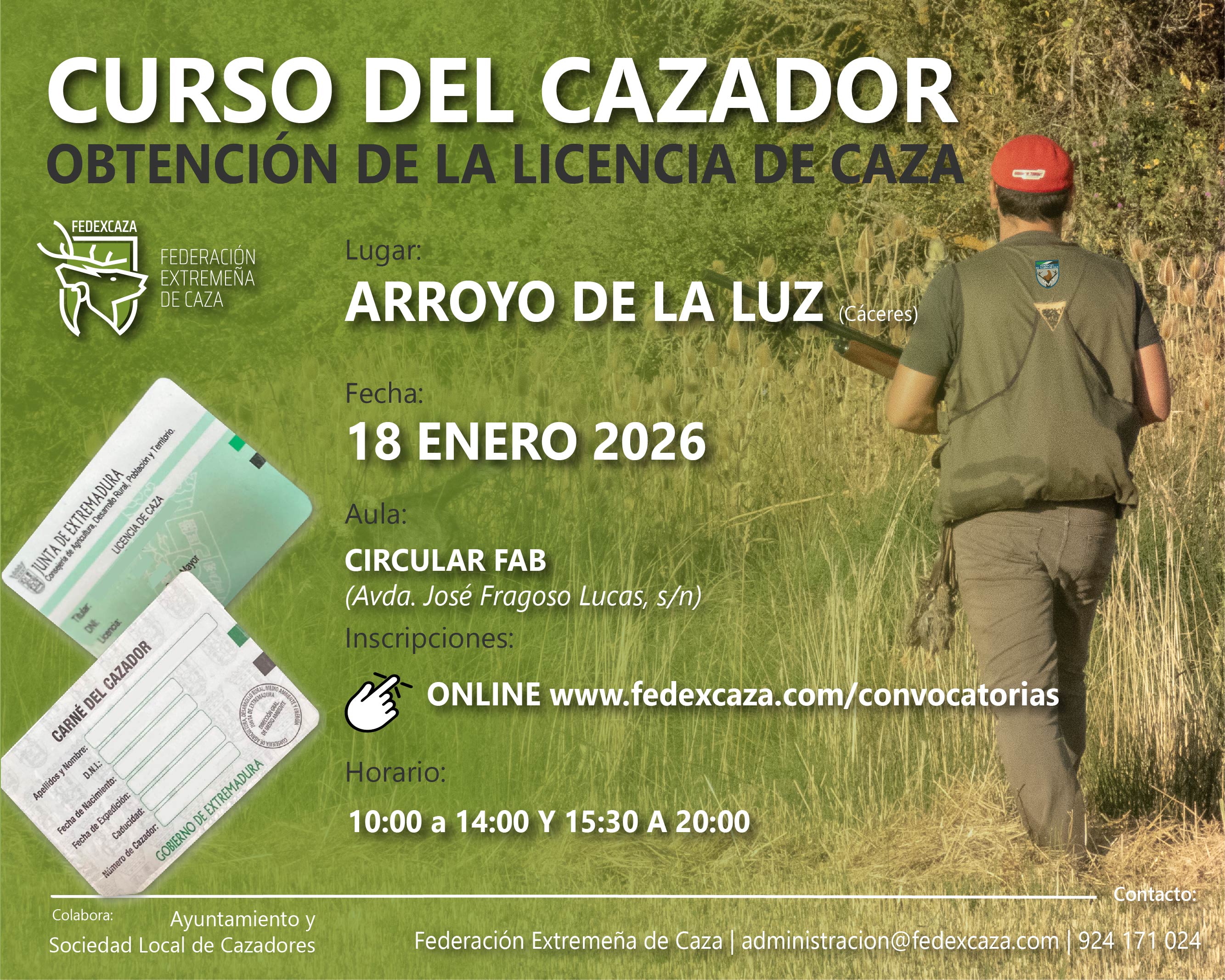 Curso del Cazador para la obtención de la licencia de caza y carne del cazador en ARROYO DE LA LUZ el 18 de enero de 2026 y se celebrará en el CIRCULAR FAB (Avda. José Fragoso Lucas, s/n). Horario de 10:00-14:00 y 15:30 a 20:00