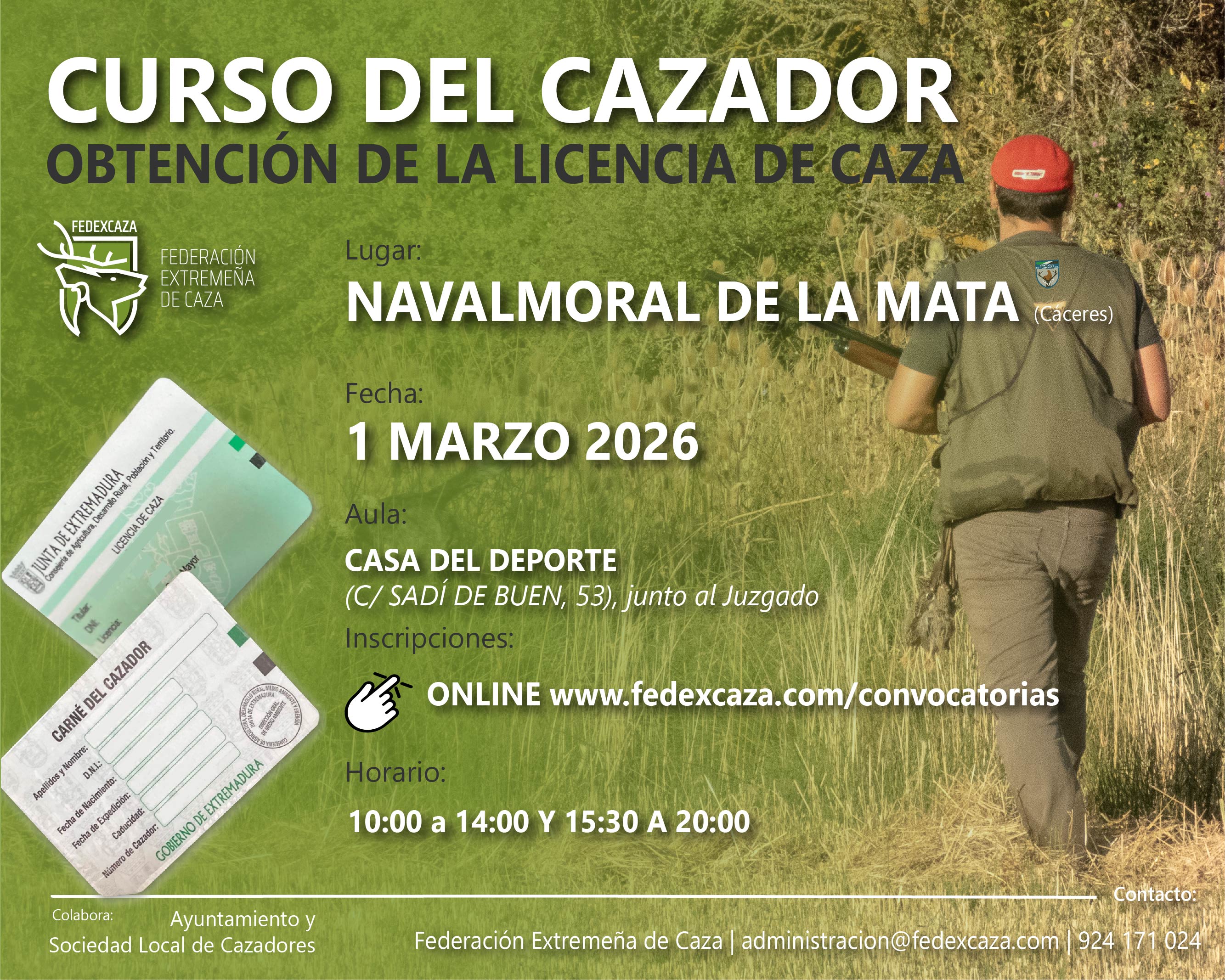 Curso del Cazador para la obtención de la licencia de caza y carne del cazador en NAVALMORAL DE LA MATA el 1 de marzo de 2026 y se celebrará en la CASA DEL DEPORTE (C/ SADÍ DE BUEN, 53), junto al Juzgado. Horario de 10:00-14:00 y 15:30 a 20:00